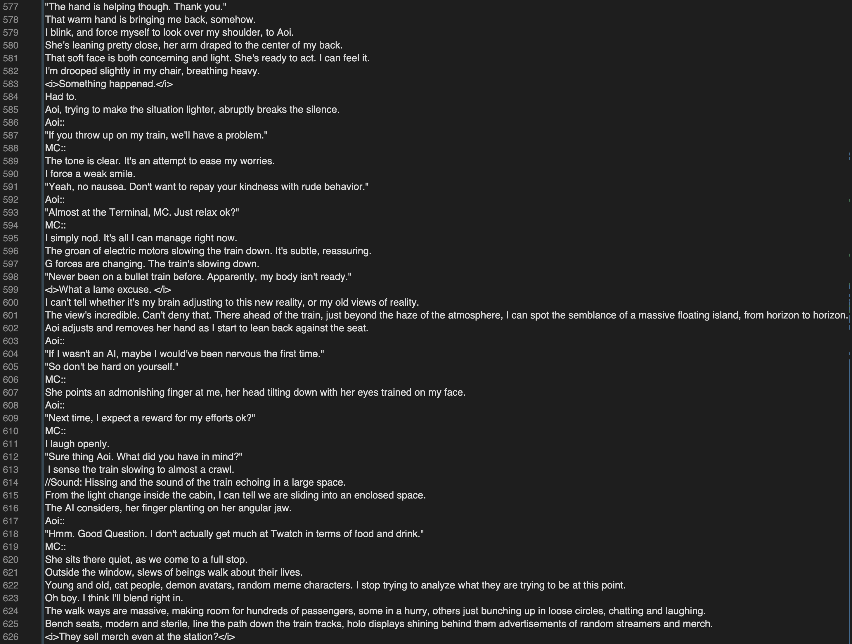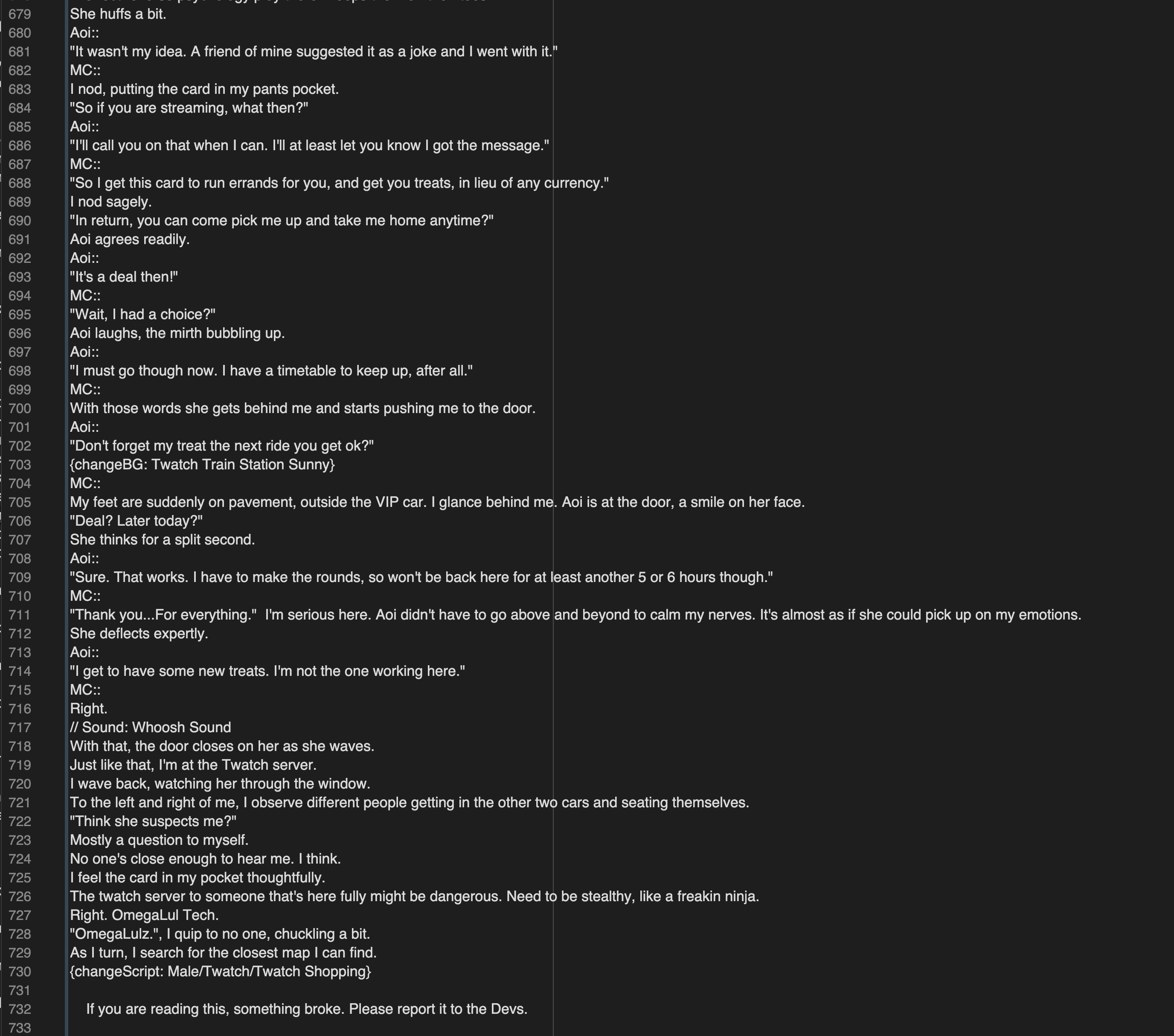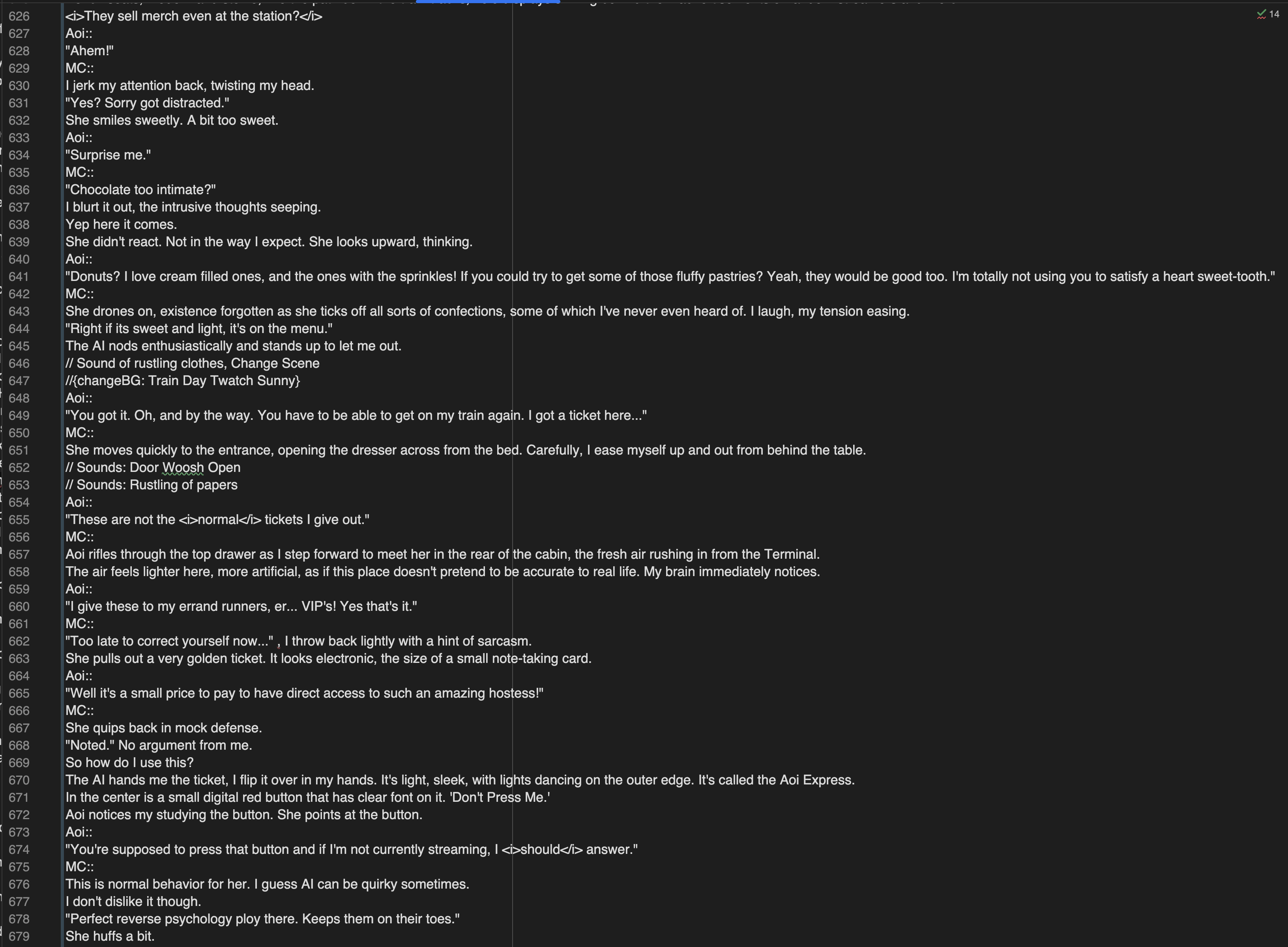 I can't share much without spoiling a ton of stuff. Some of the raw writing I will share just to show you the scope of the dialogue. This is the writing script before scenes are setup.